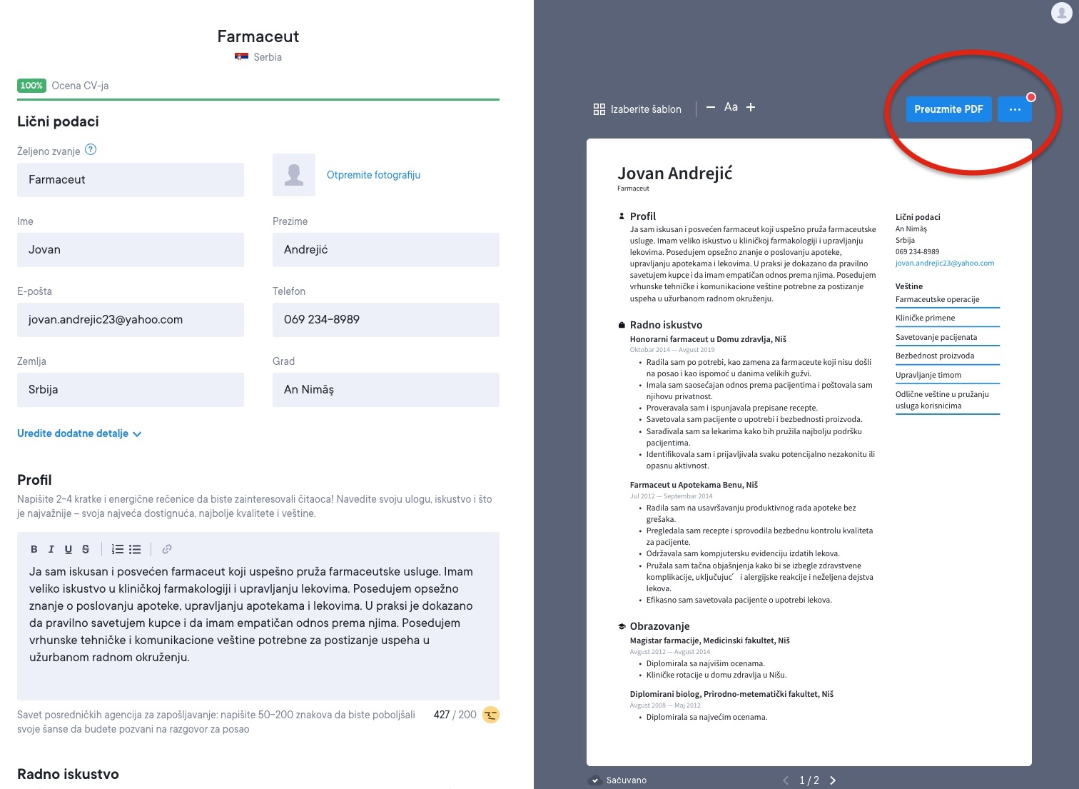 Da li mogu da preuzmem svoj CV u Word ili PDF formatu?
