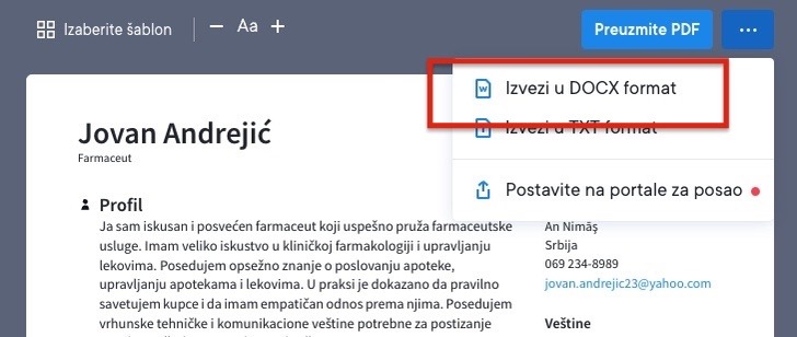 Trenutno pokrećemo beta verziju preuzimanja CV-ja u DOCX formatu, a ažuriranje će biti dostupno svim našim korisnicima nakon završenog ispravnog testiranja. To je premium funkcija koja može biti korisna u nekim zemljama gde poslodavci zahtevaju Word dokument umesto PDF-a. Ova sjajna opcija je dostupna jednostavnim klikom na dugme „...“ pored dugmeta „preuzmi“ u našem kreatoru CV-ja (vidi ispod).