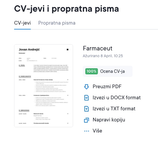 Uvek su vam na raspolaganju 3 opcije za preuzimanje vašeg CV-ja: možete ga preuzeti kao TXT datoteku (besplatno), PDF ili DOCX datoteku. Vaš CV će izgledati isto uprkos tome koju opciju preuzimanja odaberete, osim u slučaju TXT datoteke.