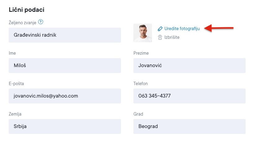 U odeljku sa ličnim podacima videćete opciju za dodavanje fotografije. Takođe možete da dodate različite fotografije za različite CV-jeve u okviru istog naloga. Ova nova funkcija vam omogućava da brzo prilagodite svoj portret za svaku poziciju za koju se prijavljujete. Takođe, sa zadovoljstvom vam možemo ponuditi novi alat za uklanjanje pozadine koji vam omogućava da bilo koju svoju fotografiju pretvorite u portret za profesionalni CV.