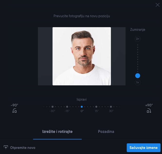 Kada po prvi put dodate svoju fotografiju u CV, biće dostupna za upotrebu u svim šablonima i različitim verzijama vašeg CV-ja. Možete podesiti sliku i promeniti i ukloniti pozadinu. Uvek možete izbrisati svoju fotografiju iz uređivača CV-ja ili da dodate novu fotografiju u bilo kom trenutku.