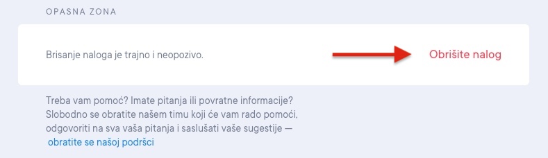 Ako želite da zauvek izbrišete svoj nalog, skrolujte do dna stranice „Podešavanja naloga“ i kliknite na „Izbriši nalog“. Pogledajte snimak ekrana ispod.