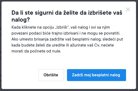Brisanje vašeg naloga sa CVapp.rs je trajno. Kada se nalog izbriše, naš tim za podršku ne može da preuzme podatke o vašem CV-ju ili propratnom pismu.