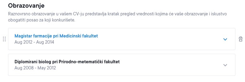 Promena redosleda odeljaka* - Redosled svih odeljaka može da se promeni ispod odeljka „Radno iskustvo“ u glavnoj koloni CV-ja. Da biste promenili redosled odeljaka, kliknite na ikonu mreže s leve strane odeljka kao što je prikazano ispod. Nakon toga možete prevlačiti odeljke gore ili dole. Pogledajte snimak ekrana ispod.